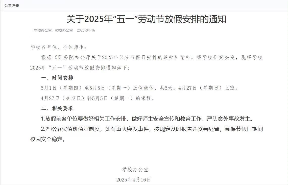 关于2025年“五一劳动节”放假安排的通知